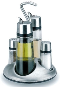 Pour huile, vinaigre, sel et poivre. Corps inox. Très stable, pas de risque de renverser les éléments de leur support lors des déplacements.
