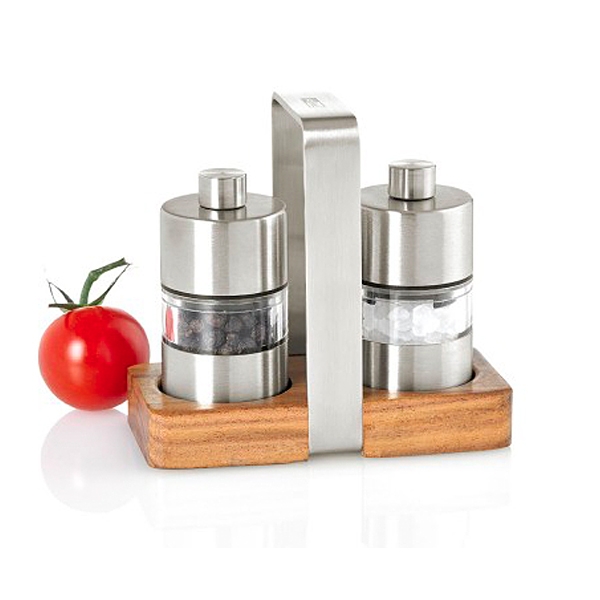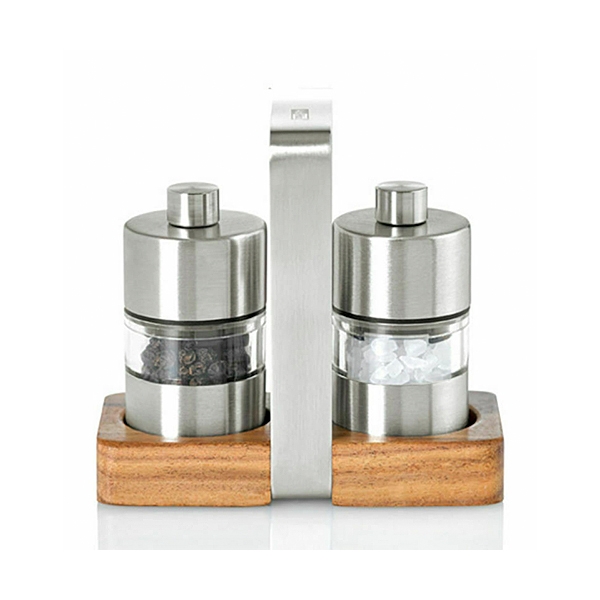 Elégant kit 3 pièces (moulin à poivre, moulin à sel, support ) en acier inoxydable, acrylique et bois d'Acacia pour laisser propre le plan de travail ou la table. Les moulins possèdent un mécanisme haute performance ainsi qu'un dispositif de réglage de la mouture allant du fin à gros.