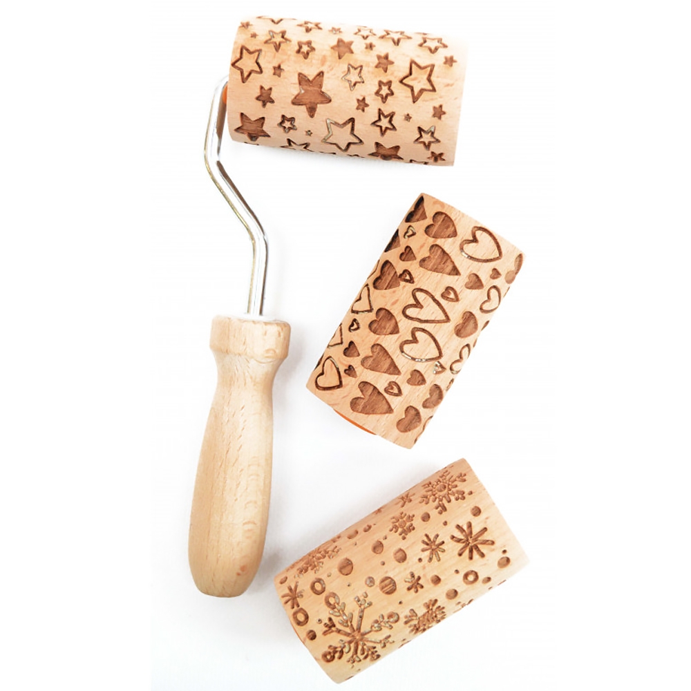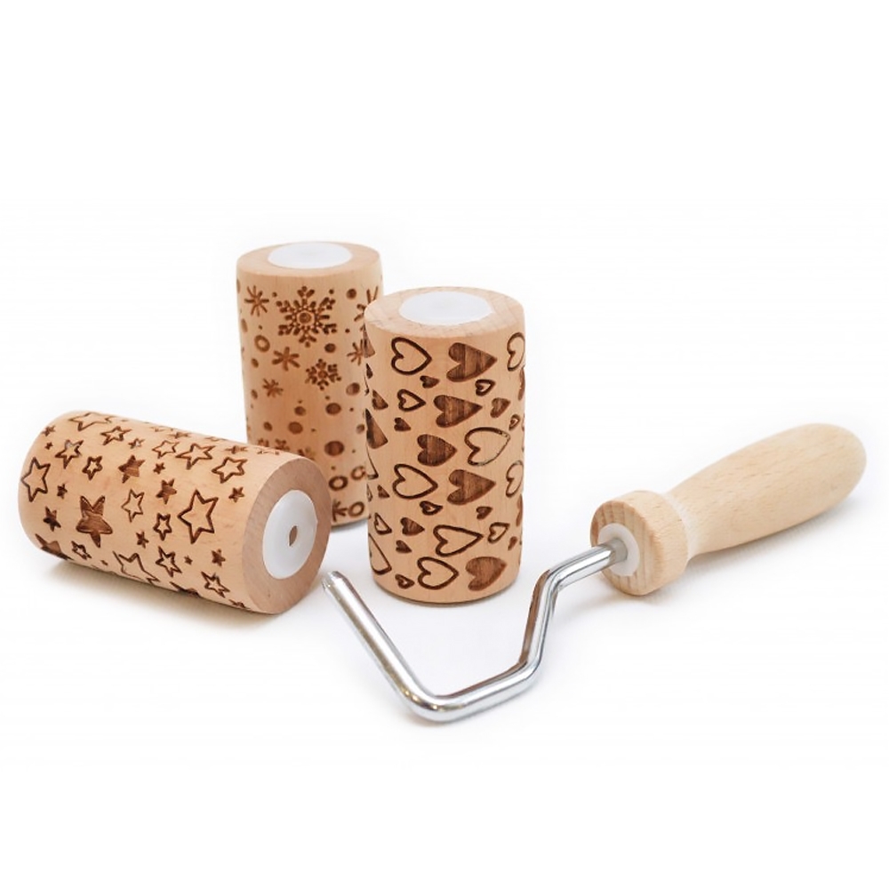 Ensemble comprenant un mini-manche et 3 rouleaux embossoirs interchangeables en bois aux motifs différents pour graver la pâte avant cuisson. Du plus bel effet pour la réalisation de biscuits.