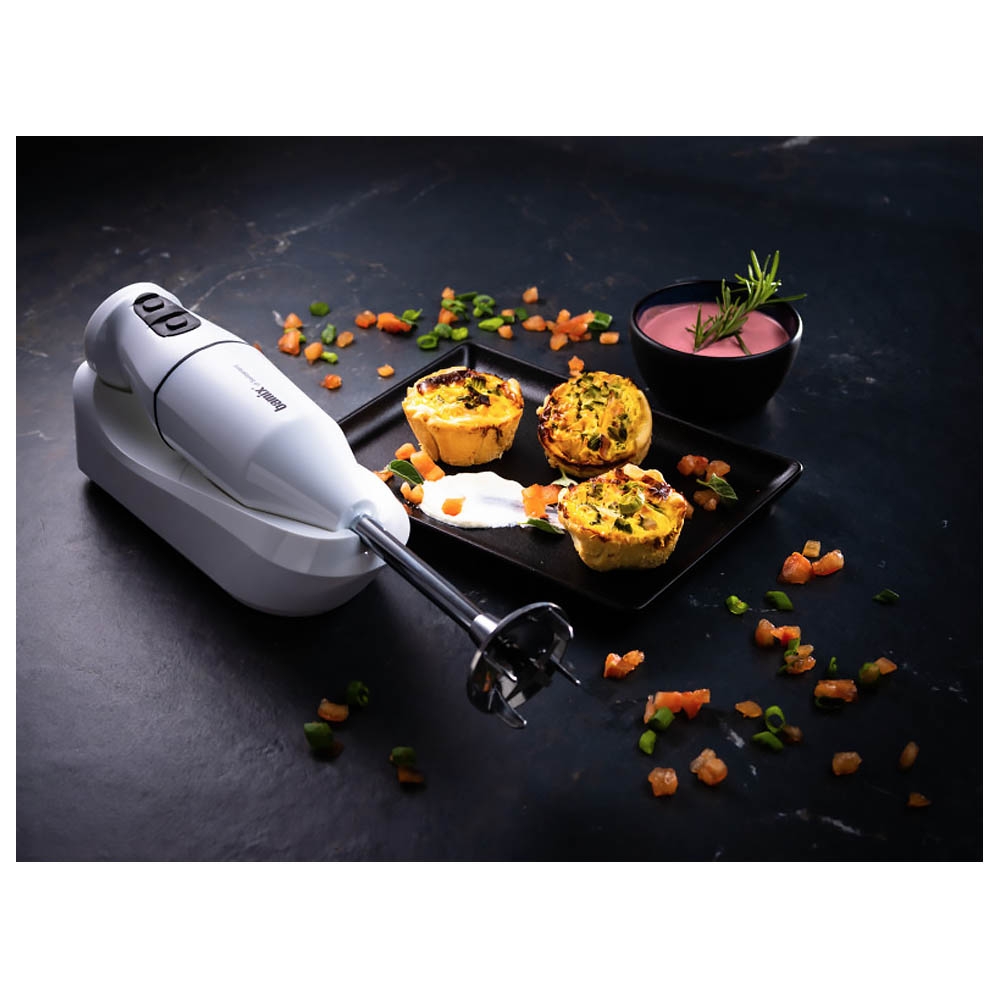 Plus besoin de se soucier d'une prise de courant, il vous assistera jusqu'à 20 minutes pour vous permettre de réaliser toutes vos recettes où que vous soyez. Accessoirisé avec 3 embouts (couteau étoilé, disque fouet, disque mélangeur), il est compatible avec tous les accessoires Bamix. Puissant, autonome et maniable. Comme tous les produits Bamix, le Mixeur Plongeant sans fil est intégralement fabriqué à Mettlen en Suisse.