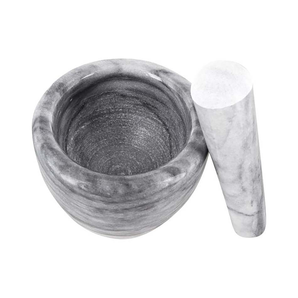En marbre. Garanti 2 ans. Dimensions : Hauteur totale: 7.5 cm; hauteur intérieure: 4.5 cm; diamètre extérieur 10 cm; diamètre 7.4 cm. Le pilon: 13 cm.