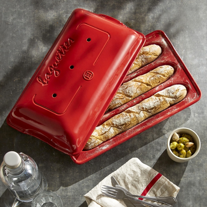 Le Moule à baguettes Emile Henry a été conçu pour vous offir un résultat à la hauteur de vos attentes. Sa particularité est de recréer les mêmes conditions que dans un four à pain traditionnel. Le couvercle permet de maintenir un taux d'humidité optimal en début de cuisson. Le moule est fabriqué en céramique réfractaire et permet donc une cuisson homogène.