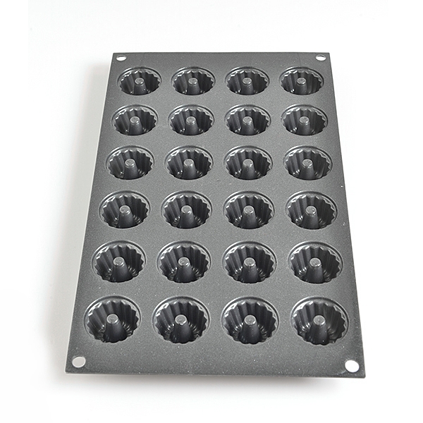Plaque 24 empreintes mini-Kougloff réalisée en silicone platine métallisé. Grâce à l'ajout de particules métalliques, la cuisson est plus homogène, dorée et croustillante. Le temps de cuisson est plus court. Ce moule est à utiliser exclusivement dans un four traditionnel à chaleur tournante ou aux micro-ondes.