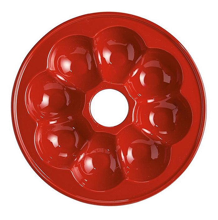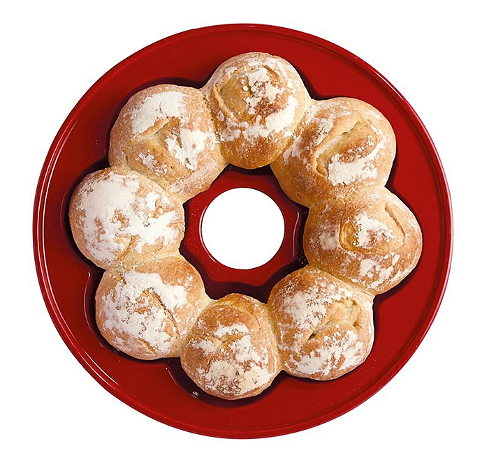Moule en céramique réfractaire permettant de réaliser une couronne de petits pains légers et croustillants. Les propriétés de la céramique réfractaire du moule et de son couvercle permettent de maintenir le taux d'humidité idéal pendant la cuisson du pain pour obtenir une mie bien levée et légère ainsi qu'un croustillant parfait. Les 8 cavités du moule permettent de cuire 8 petits pains de taille identique, bien formés et faciles à séparer proprement. Divisez simplement votre pâte en pâtons égaux, placez-les dans les encoches farinées et enfournez avec le couvercle.