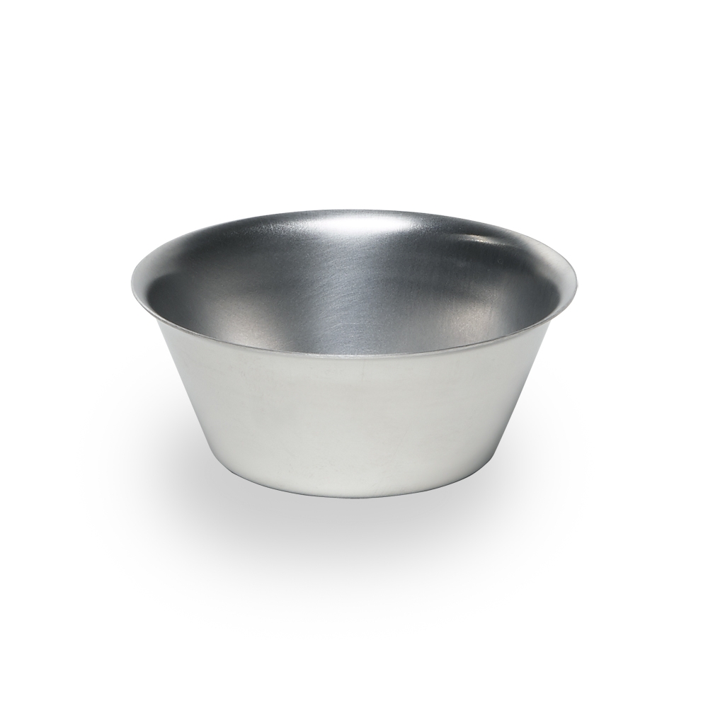 Acier inoxydable. Diamètre du haut 7 cm, diamètre du bas 4.5 cm, hauteur 3 cm. Passe au lave-vaisselle. Va au four.