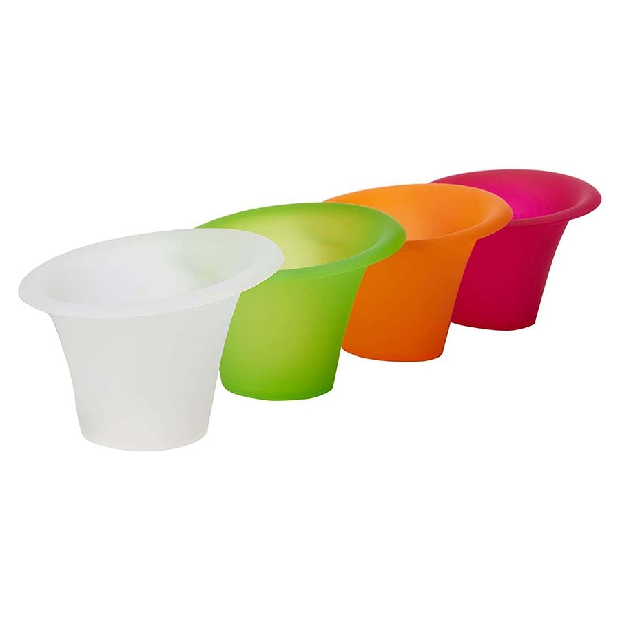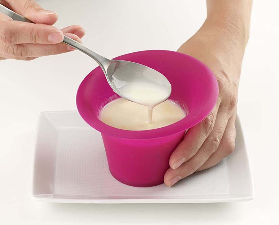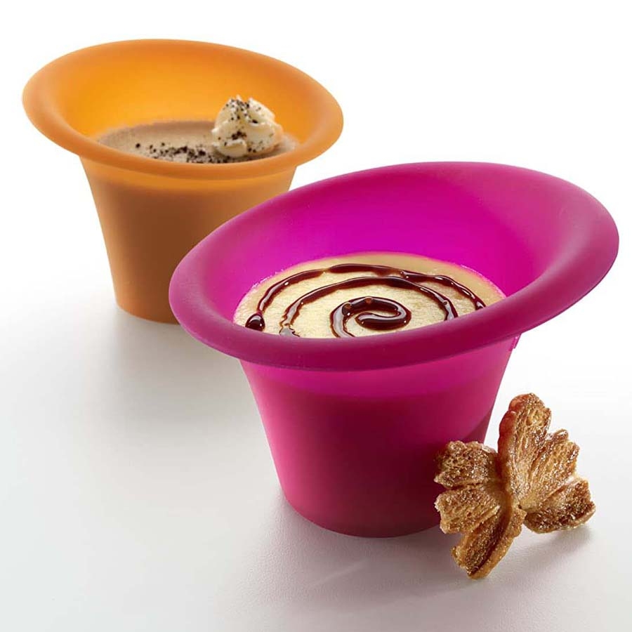 Silicone platinum. Sans BPA. Dimensions : ø 8 cm Hauteur 7 cm. Va au four et au micro-ondes. Lavage à la main et au lave vaisselle. 4 couleurs assorties blanc, vert, rose, orange. Livret de recettes.