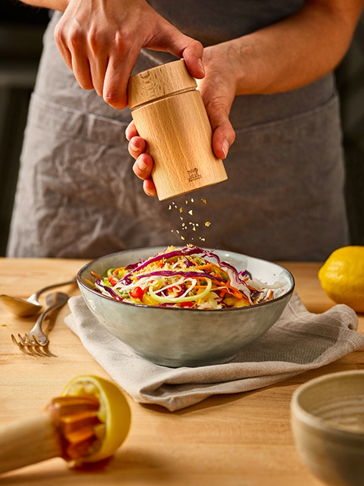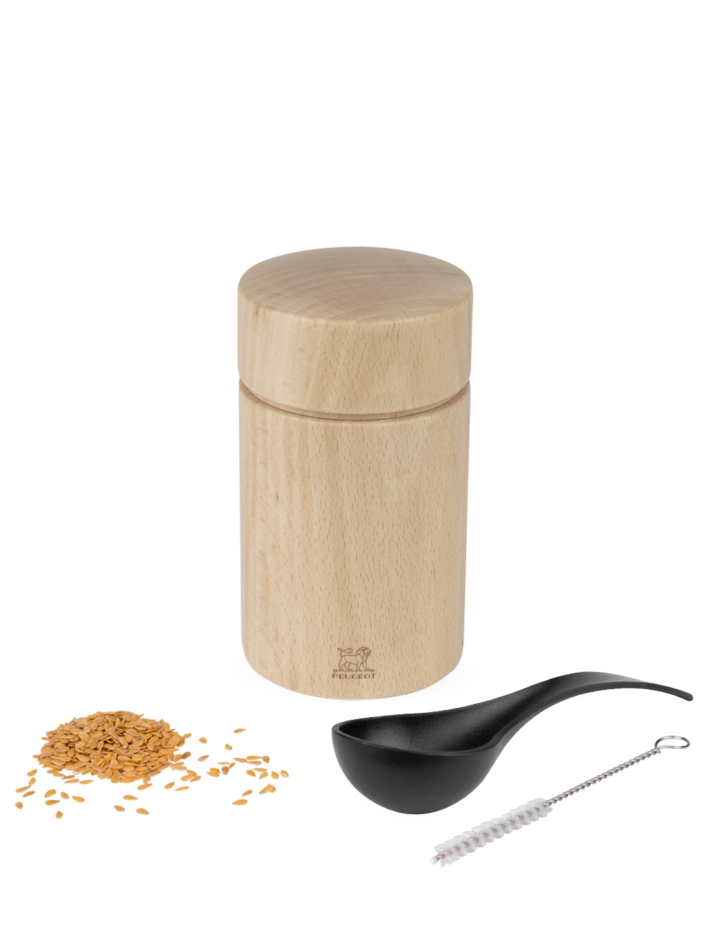 un moulin manuel en bois, made in France, dont le mécanisme breveté a été spécialement conçu pour moudre les graines de lin et le sésame puisqu’il s’adapte à leur consistance et à leur dureté. Ce mécanisme, entièrement démontable pour un nettoyage facile et express est garanti pour une durée de 5 ans. Ce moulin en bois au chapeau amovible pour un remplissage minute s’accompagne d’une cuillère doseuse permettant de mesurer l’équivalent de 10 grammes de graines de lin.