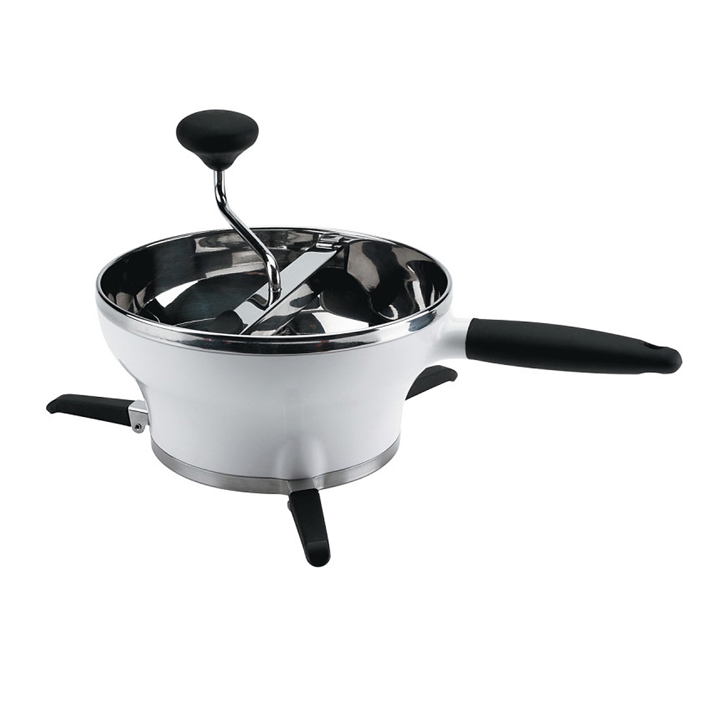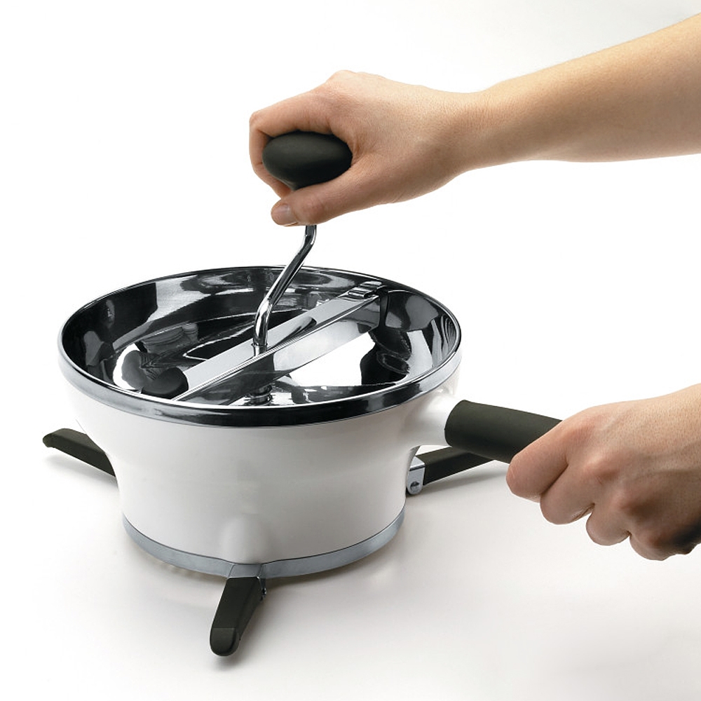 Bol intérieur inox. Se pose sur des ustensiles jusqu'à 28 cm. Dimensions (L x l x h) : 33,7 x 19 x 21 cm. Bouton de déblocage exclusif. Pieds anti-dérapants. Poignée et manivelle en caoutchouc. Pieds repliables sous le bol. Va au lave vaisselle. Livré avec 3 grilles pour mouliner fin (0.15 cm), moyen (0.3 cm) ou gros (0.7 cm).