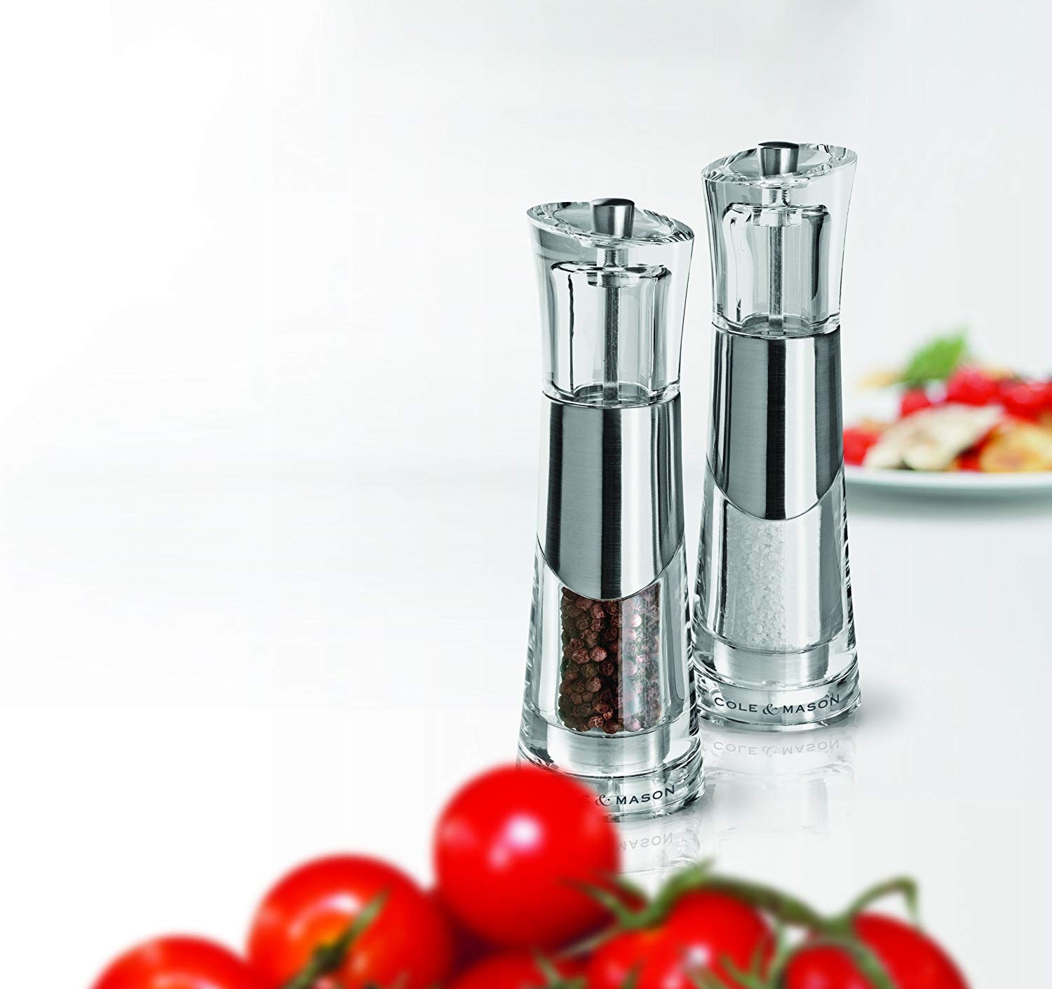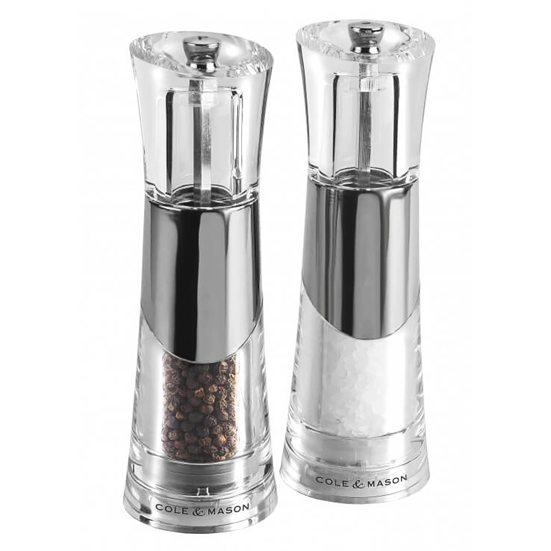 Corps acrylique. Mécanisme poivre en acier trempé haute précision. Mécanisme sel en céramique. Mécanismes garantis à vie. Hauteur 18.5 cm.