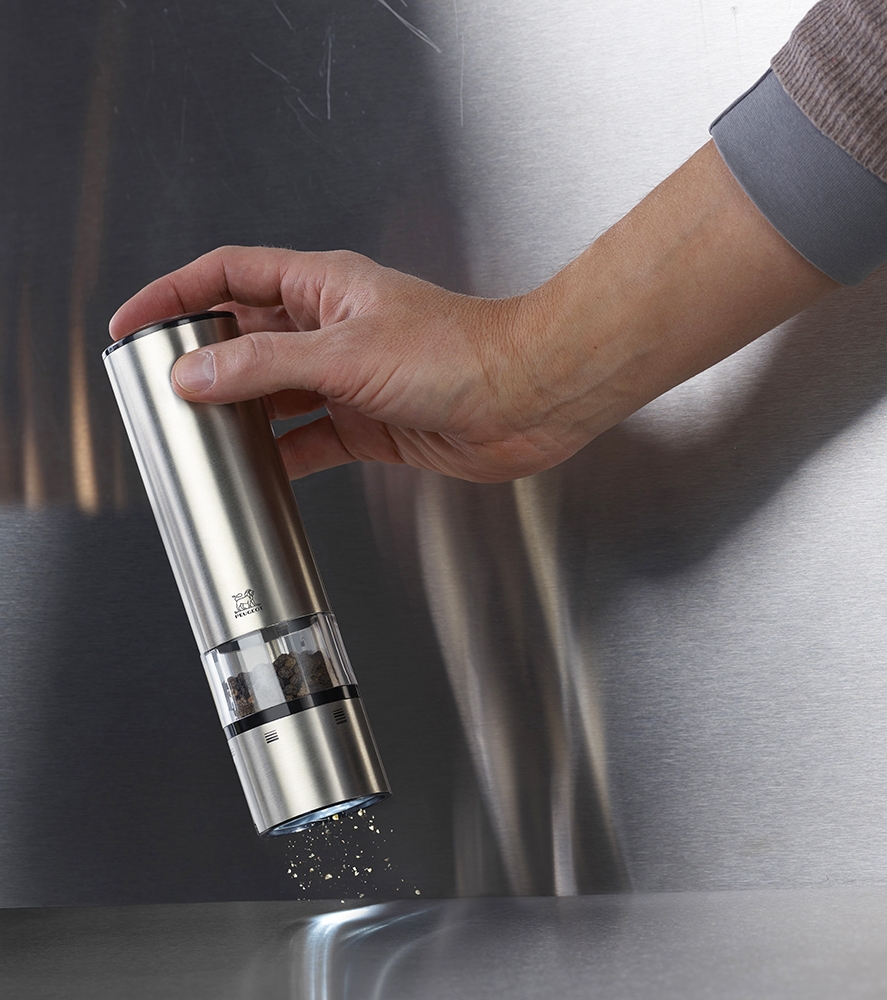 Le moulin PEUGEOT électrique Elis sense est équipé des mécanismes traditionnels PEUGEOT sel ou poivre dont l’efficacité n’est plus à prouver. Un simple effleurement suffit pour déclencher le mécanisme pour moudre sel ou poivre ce qui permet de tenir le moulin d’une seule main, très pratique lorsque l’on cuisine !