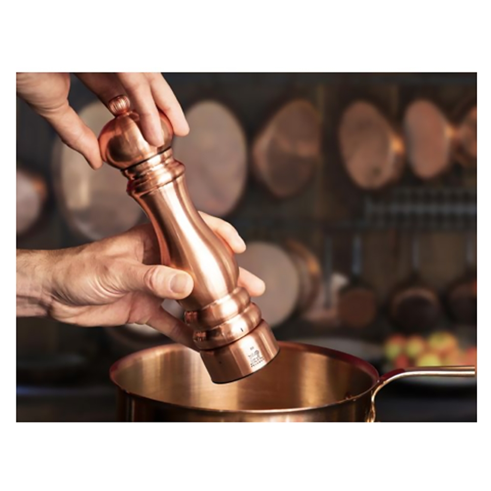 Le Moulin Paris Chef Cuivré Peugeot est une référence absolue dans l'univers de l'art de la table. Réalisé en acier inoxydable et souligné par une magnifique finition cuivrée (procédé technique de dépôt de cuivre), ce moulin est équipé d'un mécanisme U'Select permettant de choisir parmi 6 tailles de moutures préréglées. Une grosse mouture révèle les arômes du poivre tandis qu'une mouture fine fait ressortir le caractère piquant du poivre utilisé. De fabrication française, son mécanisme est garanti sans limitation de durée. Tel un phare en haute mer, ce moulin captera obligatoirement l'attention de vos convives.