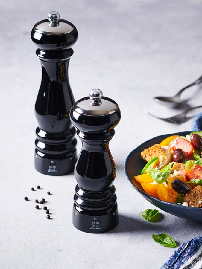 Son corps d'un noir veiné intense est surmonté d'une coupelle métallique éclatante comme un miroir, cachant une fonction inédite de remplissage facilité. Peugeot démontre avec ce moulin, tout le soin et le sens du détail qu'il accorde à l'usage de ses produits.