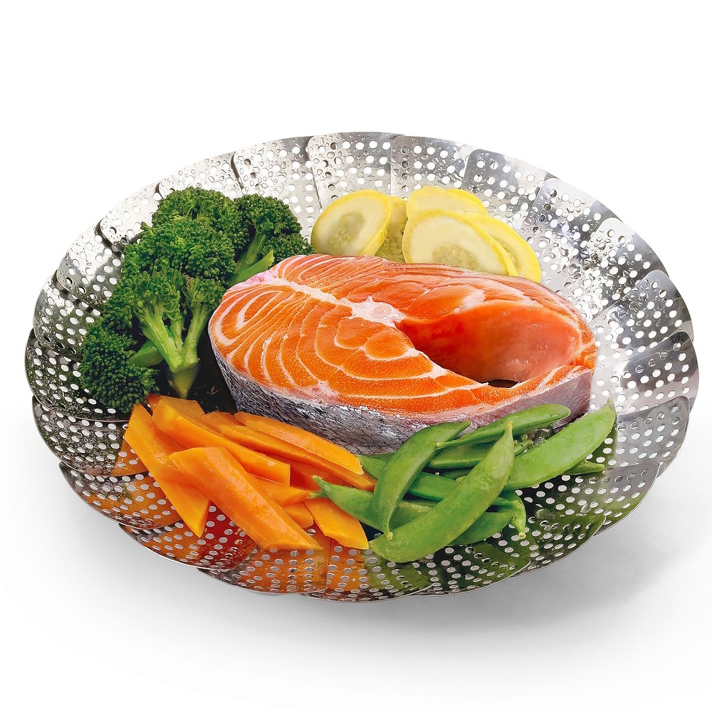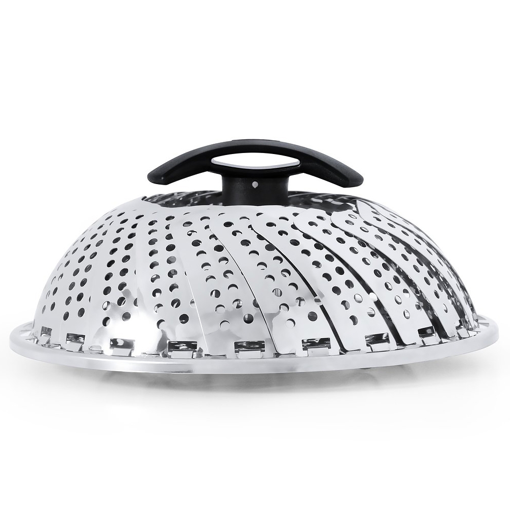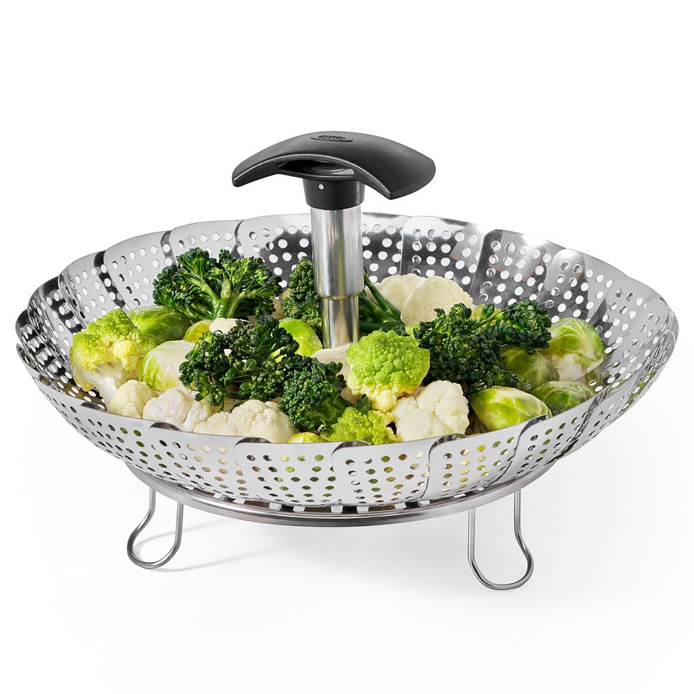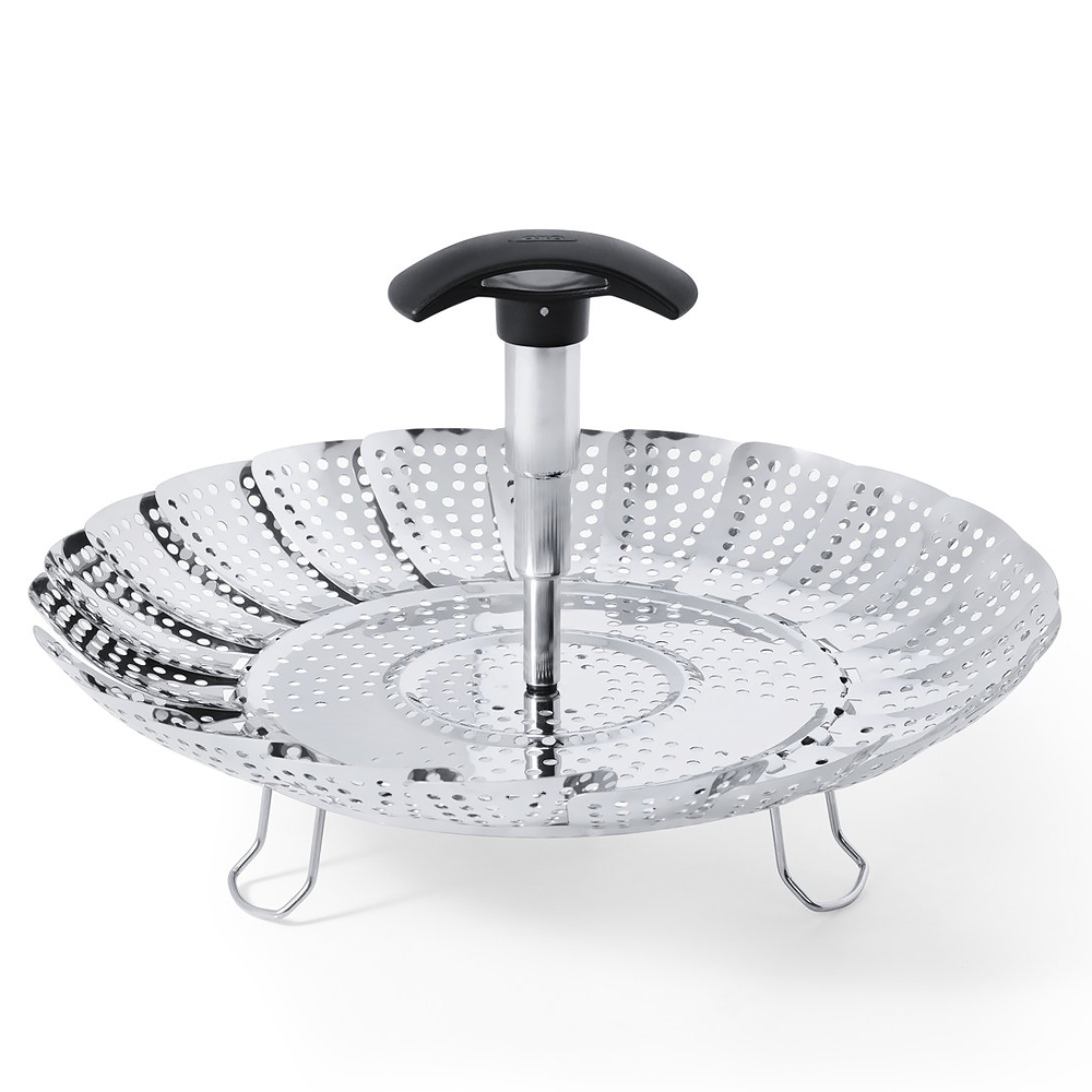 Le Panier Vapeur universel repliable Oxo transforme la plupart de vos ustensiles de cuisson en cuit-vapeur sûr et efficace. Equipé de pieds (rétractables pour un encombrement réduit), ils évitent à vos légumes et autres aliments à cuire de baigner dans l'eau. La poignée rétractable et le panier repliable réduisent encore son encombrement pour le rangement.