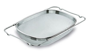 Inox. Idéale pour égoutter et nettoyer les légumes à grande eau. Son support extensible permet de s’adapter à la plupart des éviers. Longueur mini 34 cm maxi 55 cm. Largeur 24 cm.