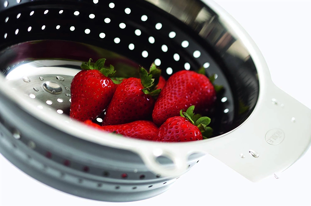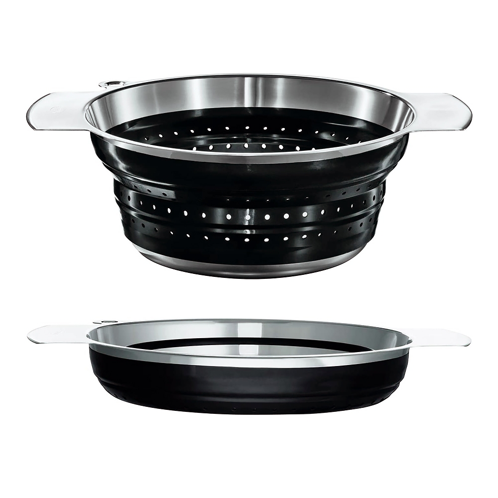 La passoire pliable Rösle est idéale pour égoutter des légumes, des féculents et pour laver les salades. Elle est équipée de perforations tout autour garantissant un égouttage rapide. Grâce à son corps en silicone, la passoire pliable Rösle peut être pliée pour atteindre une hauteur de 4 cm. Pratique pour le rangement et ainsi gagner de la place !