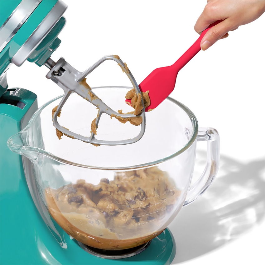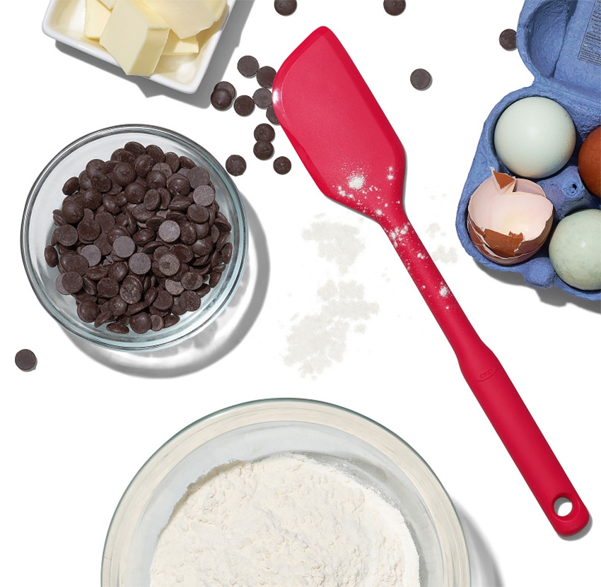 Petite spatule en silicone thermorésistant avec orifice de suspension en haut du manche.