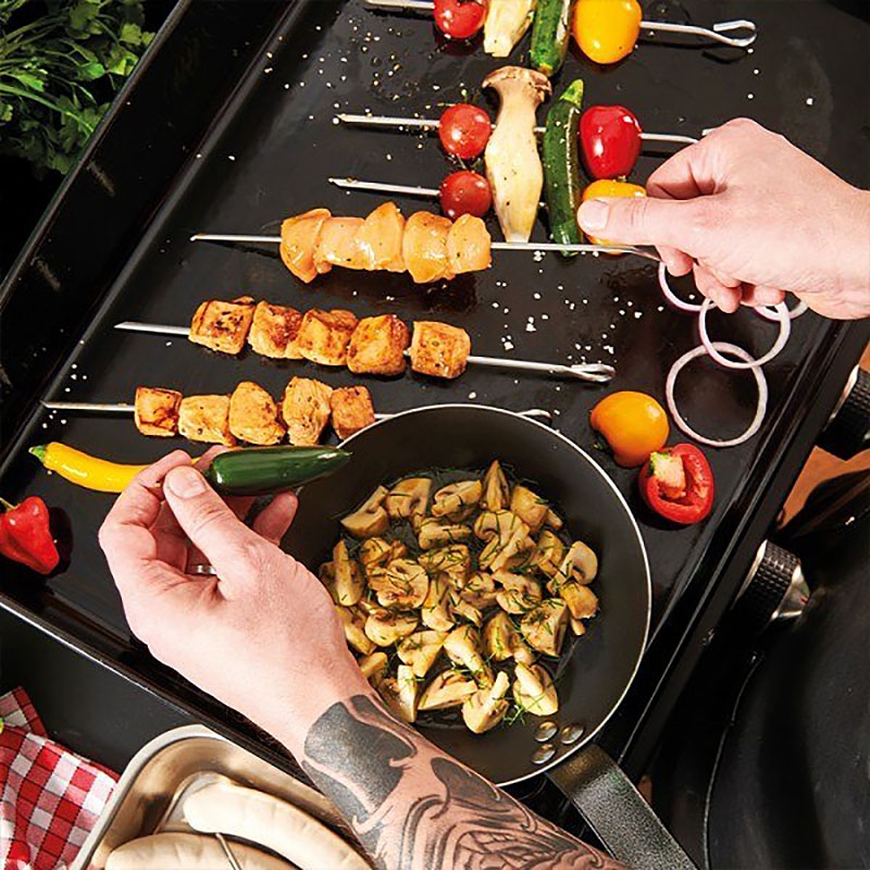 La Plancha électrique De Buyer par Le Marquier est destinéee à une utilisation outdoor. Elle est équipée d'une plaque en fonte émaillé (60x40 cm), et de 2 zones de cuisson avec radiants intégrés réglable de 50 à 300°C. Elle fonctionne sur courant 220V , possède des boutons de commande ergonomiques et antidérapants avec témoins lumineux de chauffe. La plaque est conçue avec des rebords hauts ainsi qu'un orifice d'évacuation des jus de cuisson qui sont récupérés dans un bac en inox (9x12 cm) dissimulé en façade avec système d'ouverture "push pull"