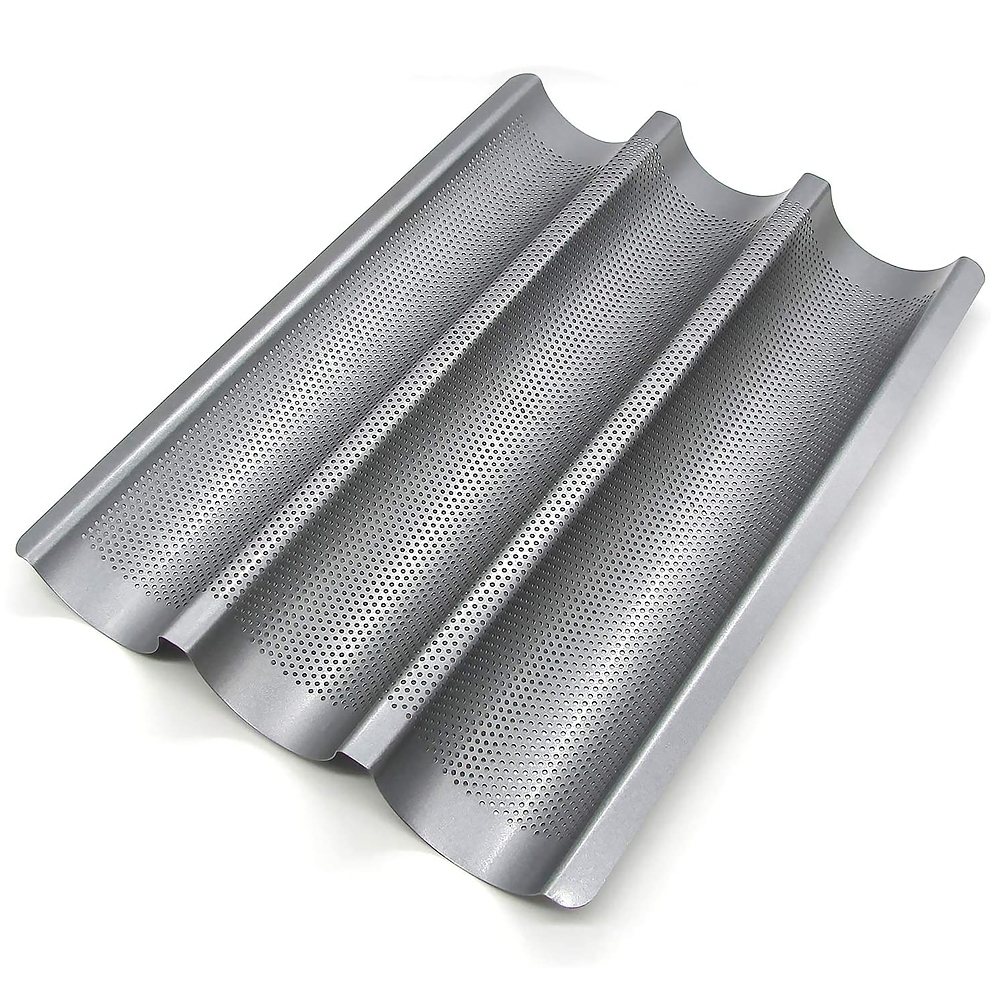 Plaque de Cuisson Perforée en Inox De Buyer pour la réalisation de 3 baguettes. La technologie R-System De Buyer permet de donner du croustillant aux pâtisseries et pains maison grâce à ses perforations qui assurent une cuisson régulière et optimale.