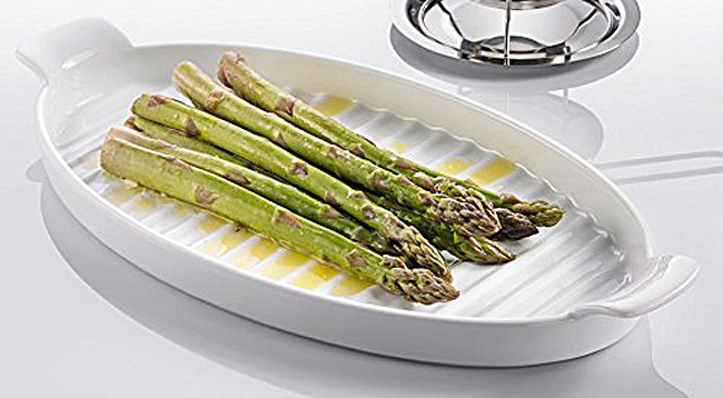 D'une utilisation facile grâce à ses 2 poignées, son fond est rainuré empéchant les asperges de baigner dans leur jus.