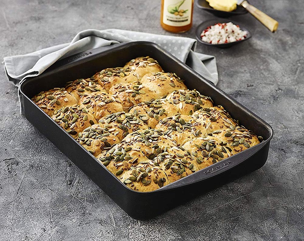 Le plat à four anti-adhésif Scanpan est garanti sans PFOA/PFOS et est compatible tous feus sauf induction. Réalisé en fonte d'aluminium, il est doté d'un fond épais pour une répartition homogène de la chaleur et supporte des températures allant jusqu'à 260°C. L'entretien est aisé au lave-vaisselle.