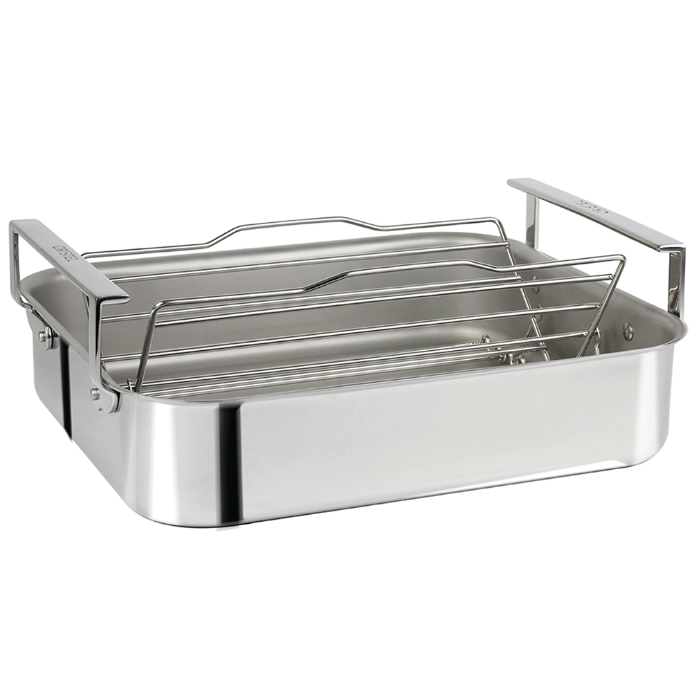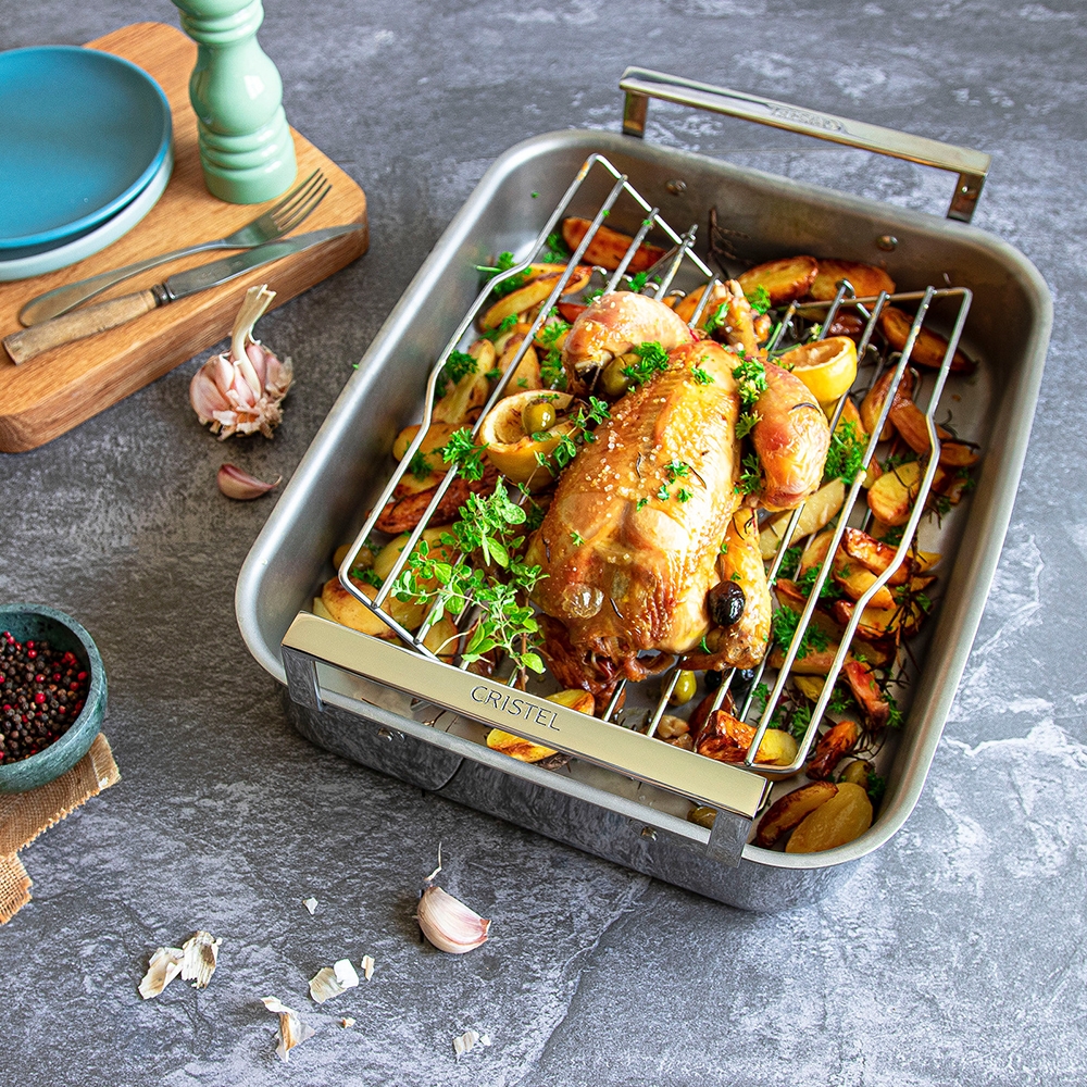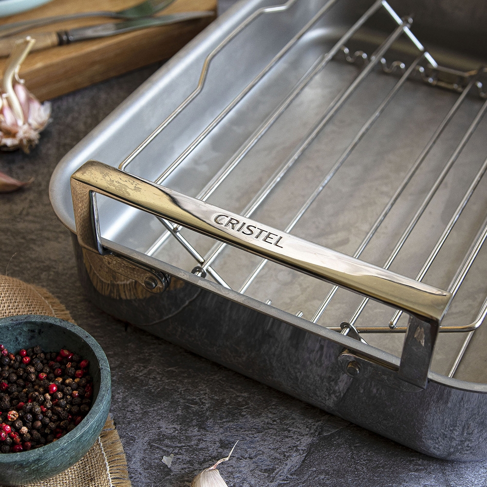 Plat à four réalisé en acier inoxydable 18/10 avec finition brillante. Sa conception Multiply (inox/aluminium/inox de forte épaisseur) lui permet d'être compatible tous feux y compris l'induction. Il est équipé d'une grille-berceau en fil d'inox réglable et rabattable pour un rangement peu encombrant mais aussi pour une utilisation en position horizontale (cuisson au four de poissons, côtes de boeuf, carré d'agneau etc..) Ses dimensions sont maximum pour pouvoir entrer dans un four classique (largeur minimale du four : 43,5 cm) grâce à ses anses non débordantes. Les anses rivetées sont très longues pour permettre un accès facile sans risque de se brûler même avec des maniques.