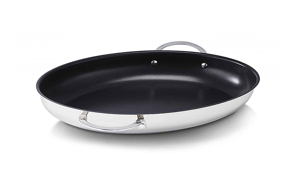 La forme ovale de la Poêle à poisson Beka est spécialement adaptée à la cuisson de poissons entiers. Revêtue anti-adhésive et maunie de 2 anses rivetées asymétriques, elle est également adaptée pour frire des brochettes de viande. Son revêtement Dualforce 3 couches renforcé de céramique est garanti sans PFOA. Elle est extrêmement résistante et facile à nettoyer. Le positionnement de ses anses facilite l'usage dans un four.