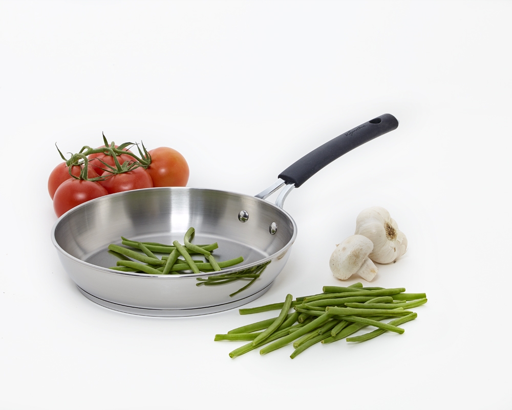 Inox 18/10. Fond Lagoseal anti-déformation épaisseur 5,5 mm. Poignée rivetée avec revêtement silicone isolant effet "soft touch". Tous feux et induction. Inox garanti 25 ans. Fabriquée en Italie.
