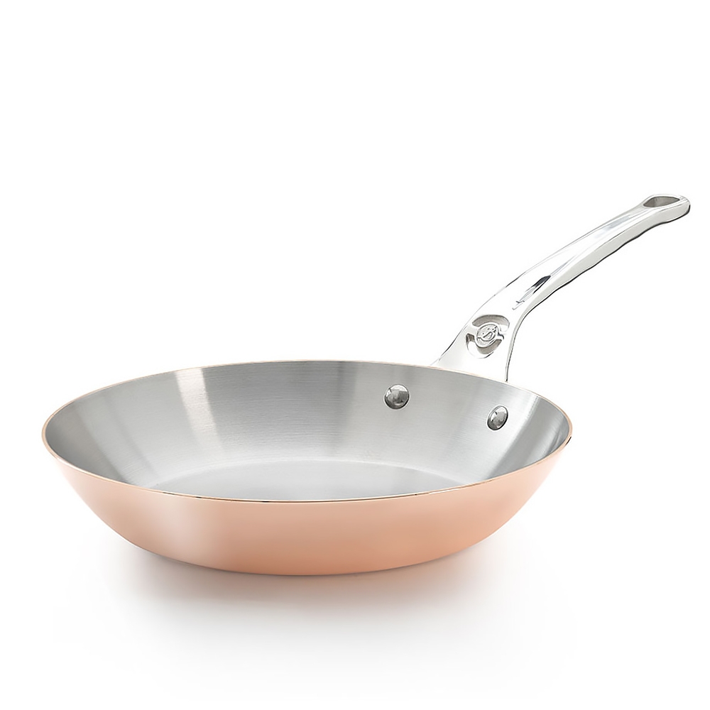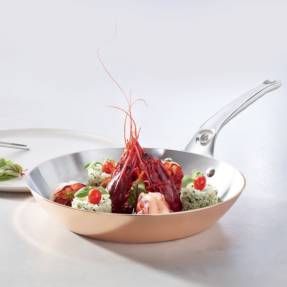 Les poêles rondes Inocuivre De Buyer possèdent une jupe évasée sans angles vifs permettant de faire glisser facilement les aliments dans un plat. Elles sont parfaites pour frire, saisir, flamber, pour le service et la présentation. Elles sont composées à 90 % en cuivre à l'extérieur et à 10 % en inox à l'intérieur pour une répartition optimale de la chaleur tout en préservant parfaitement les aliments et en offrant un entretien des plus facile. Fabriquée en France, elles sont d'une esthétique épurée et élégante avec leur queue ergonomique en fonte d'inox rivetée. Compatibles tous feux sauf induction.