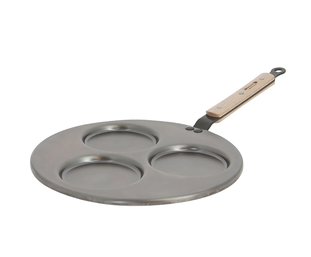 La Poêle Triblinis Mineral B Bois De Buyer et sa queue feuillard habillée de deux plaquettes de bois de hêtre Vosgien finies à la cire d'abeille vous permettra de réaliser simultanément 3 blinis pour vos lunch. Sa queue rivetée et courbée à la française ( indémanchable), est ergonomique et d'une manipulation facile