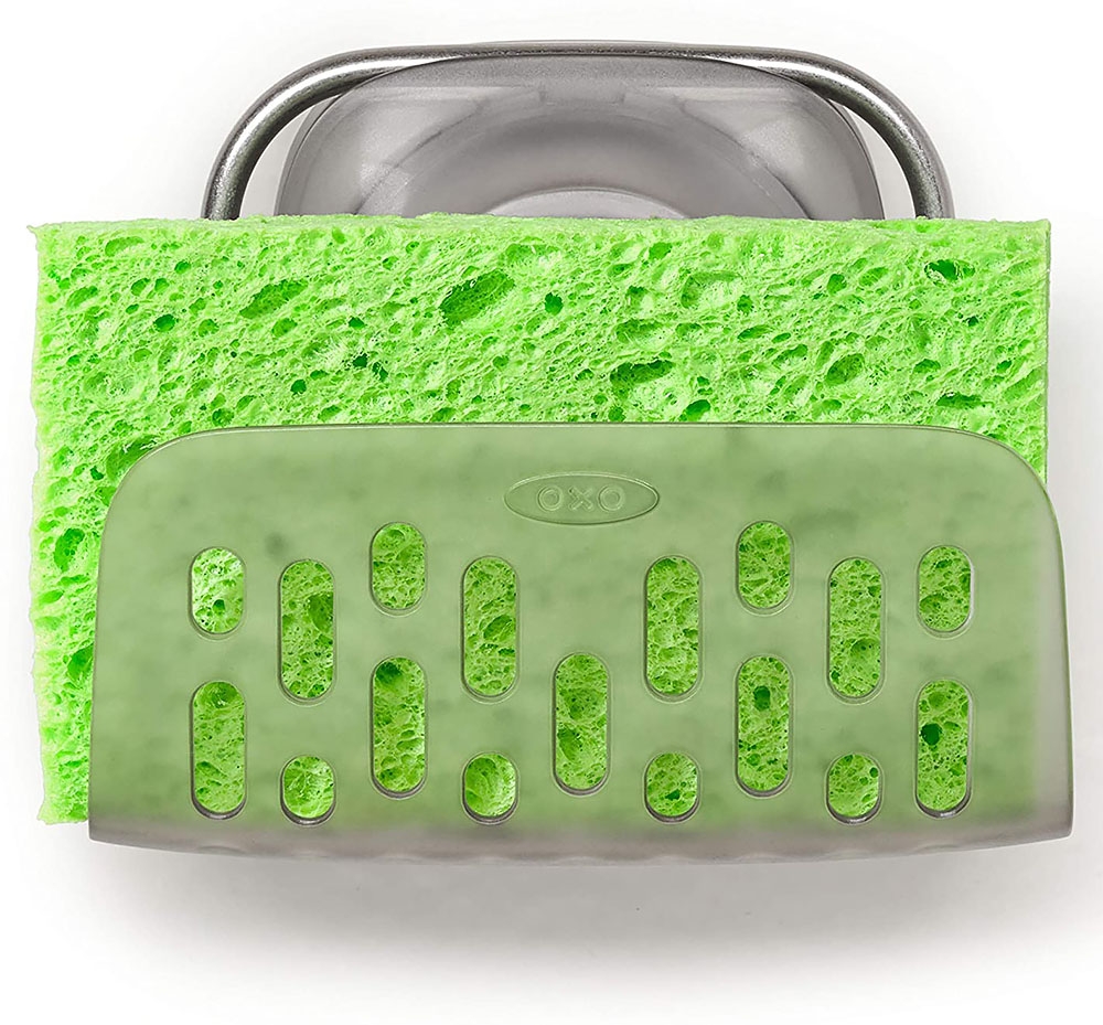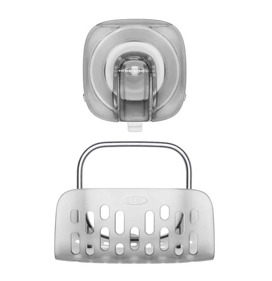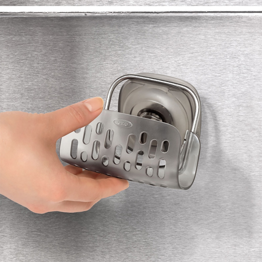 Le porte éponge Oxo Stronghold est réalisé en acier inoxydable et plastique. Le support (plastique) est amovible pour un gain de place lorsque nécessaire. Il est muni de fentes d'écoulement pour un séchage de l'éponge plus rapide. Le dispositif de fixation par ventouse est très puissant et ne possède pas de phtalates.