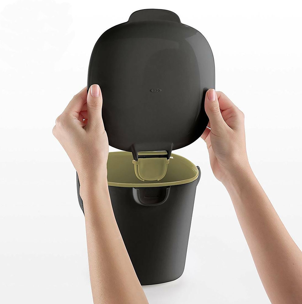 Toujours à portée de main dans la cuisine, la poubelle à compost compacte Oxo est idéale pour stocker vos déchets avant de les mettre dans votre compost.