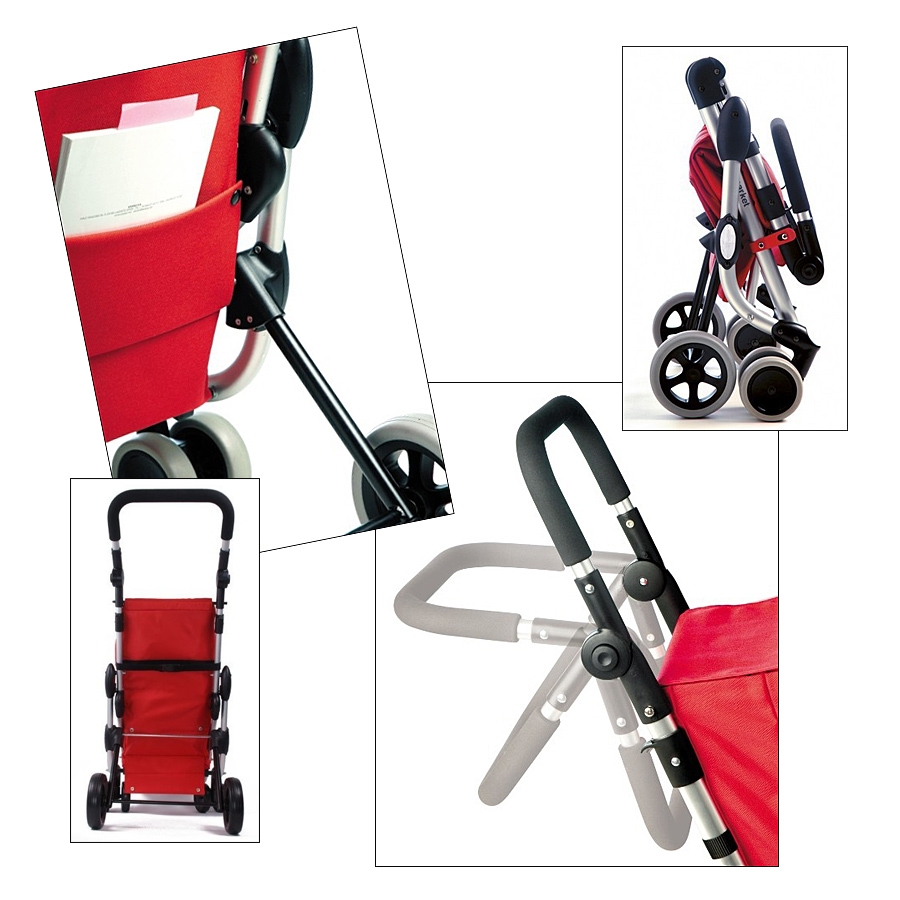 La poussette de marché GO UP Playmarket deviendra très vite le compagnon indispensable chaque fois que vous irez faire vos courses. Dotée de roues multi-directionnelles rendant son utilisation exceptionnellement maniable, elle se pousse et se plie comme une poussette d'enfant. Une poignée capitonnée réglable en hauteur permet d'adapter l'utilisation de la poussette à la physionomie de chaque utilisateur en limitant les efforts, même chargé. Le sac de la poussette est renforcé et peut contenir jusqu'à 49,5 litres en incluant une poche isotherme d'une contenance de 10 litres très pratique pour y mettre des produits surgelés. Pour rendre le nettoyage facile, la poche est amovible. La structure en aluminium se plie rapidement avec un système de sécurité, pour un encombrement minimum. La poussette de marché GO UP Playmarket possède en outre une poche extérieure sur le côté afin d'y placer une baguette ou un parapluie ainsi qu'une poche en filet sur l'arrière pour y glisser un porte monnaie.