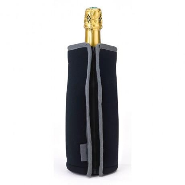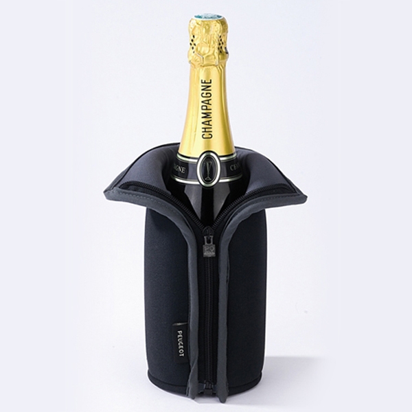 Matière néoprène. Glacettes incluses. Fermeture éclair. Convient pour les bouteilles de vin ou champagne standards.