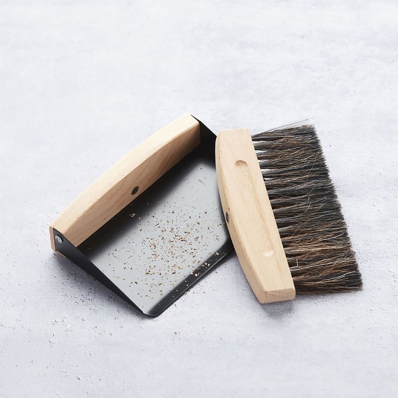 Ramasse-miettes composé d'une pelle en tôle d'acier laquée noire et d'une balayette avec manche en bambou. La pelle et la balayette sont munies d'un aimant pour être toujours l'une avec l'autre lors du stockage.