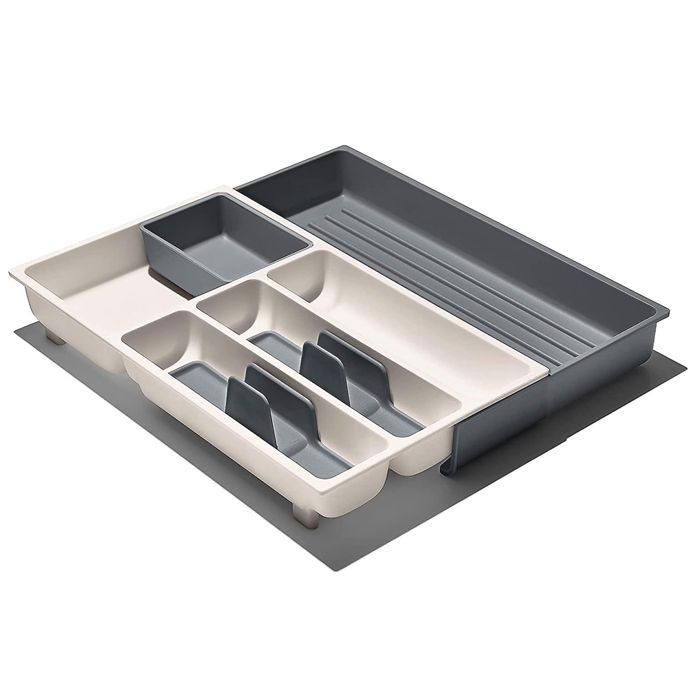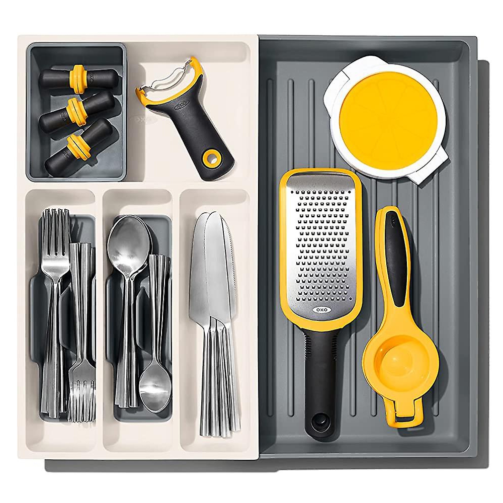 Le Range Couverts Extensible Oxo est conçu pour s'adapter parfaitement aux tiroirs de cuisine. Il comprend plusieurs compartiments pour recevoir les ustensiles en fonction de leur taille et de leur forme. La taille est extensible de 25 à 46 cm, ce qui lui permet d'être utilisé dans presque tous les formats de tiroir.