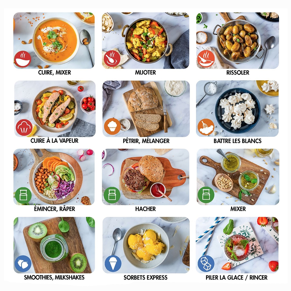 - Accessoires fournis : rapeur/trancheur, rapeur/éminceur, fouet ballon, batteur, mélange délicat, poussoir, balance de cuisine, lame polyvalente, lame de pétrissage, mélangeur, bol multifonctions, bol mixeur, mini bol, bol en acier, couvercle anti-éclaboussures, panier vapeur, disques rapeur/ éminceur.