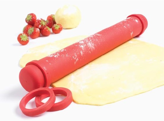 Rouleau ajustable. 4 paires d'anneaux. Pour pâte 2 mm, 4 mm, 6 et 8 mm. Convient au lave-vaisselle. Revêtement 100% silicone anti-adhérant. Longueur : 41 cm. Couleur rouge.