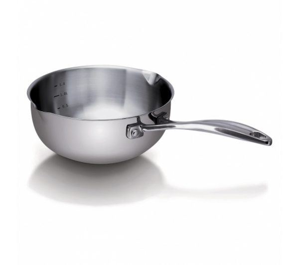Inox 18/10 garanti 25 ans. Deux becs verseurs. Triple fond capsulé thermoradiant. Manche inox riveté et isolé. Pas de risque de brûlure. Va au lave vaisselle. Qualité professionnelle. Diamètre 20 cm. Capacité 1.9 L. Convient à tous les feux y compris l'induction.