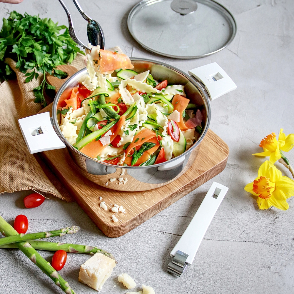 La sauteuse Cristel inox Mutine amovible grâce à son concept amovible permet un empilage parfait et un gain de place appréciable, dans vos placards comme dans votre lave-vaisselle.