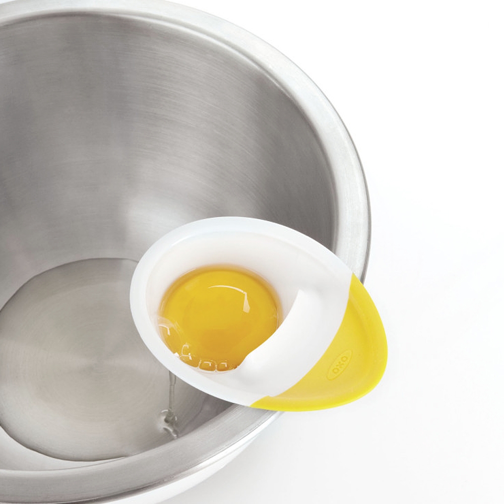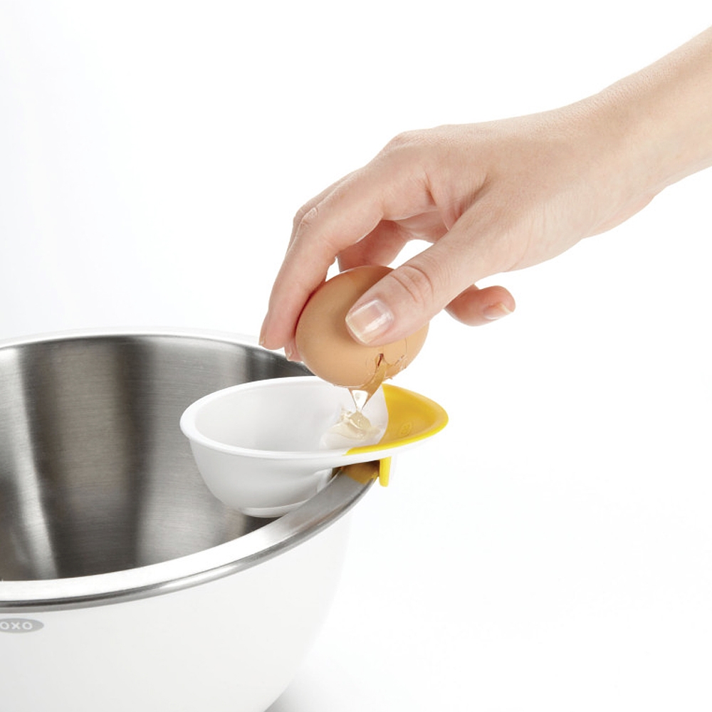 Le Séparateur d'oeuf 3 en 1 Oxo se pose sur presque n'importe quel bol ou casserole. Un astucieux ergot permet de casser un oeuf proprement. Le sérarateur permet de séparer très simplement et automatiquement le blanc du jaune.