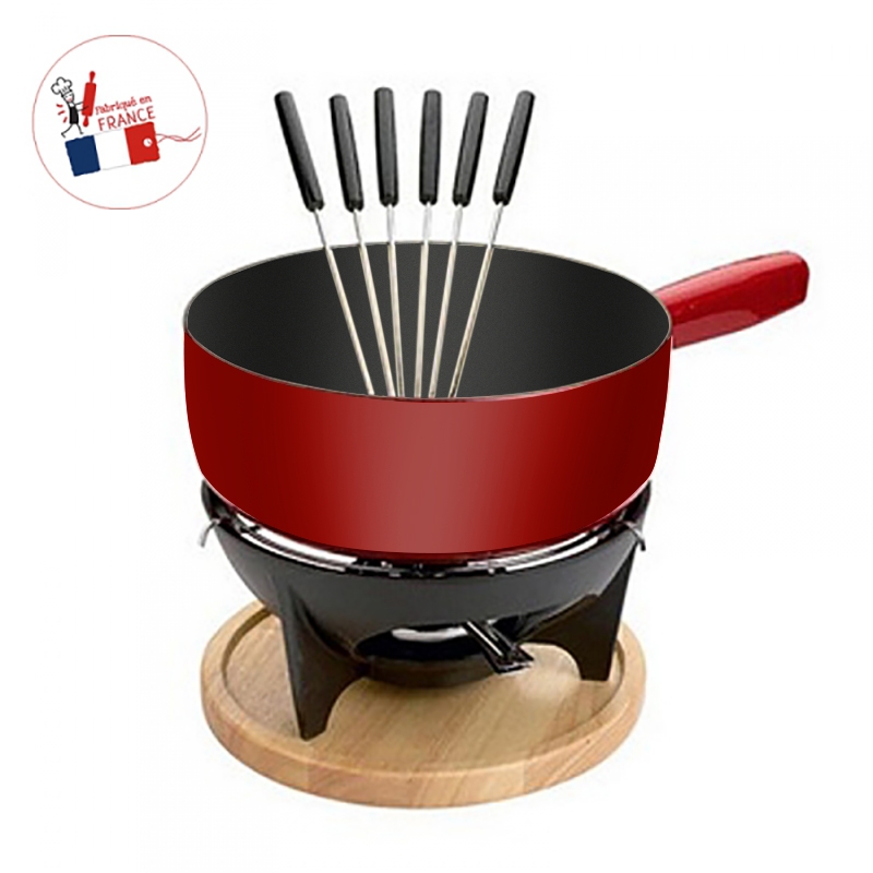 La forme du poêlon est bien adaptée pour la fondue savoyarde. Poêlon en fonte amovible intérieur émaillé. Peut être posé directement sur la source de chaleur. Livré avec support, brûleur, planche en bois et 6 fourchettes. Le brûleur fonctionne avec de l’alcool ou de la pâte à brûler.