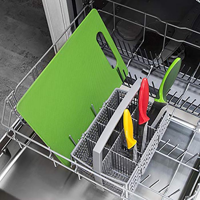 Set comprenant 3 couteaux à lame en acier inoxydable et manche offrant une prise en main agréable et sûre. Le set comprend également une planche à découper en PVC avec poignée intégrée.