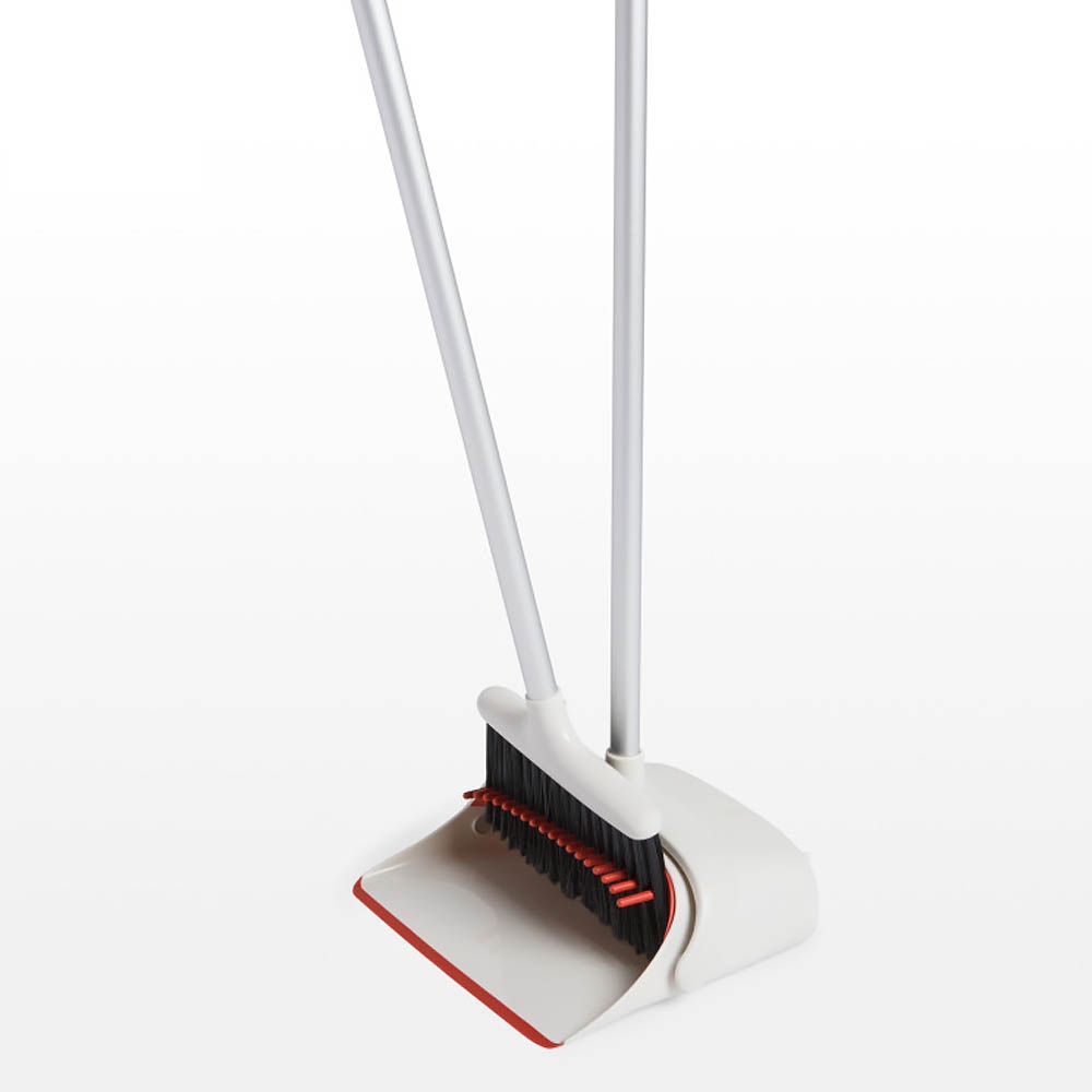 Large de 28 cm, le balai s'avère très pratique pour balayer une large surface en moins de passages. La pelle est pivotante pour la vider et est équipée de dents pour retirer les bouloches du balai. Son bord en caoutchouc épouse parfaitement le sol quel que soit la nature de ce dernier. La tête du balai est légèrement inclinée pour une meilleure ergonomie et un usage confortable. Les deux ustensiles se clipsent l'un dans l'autre pour un rangement compact.