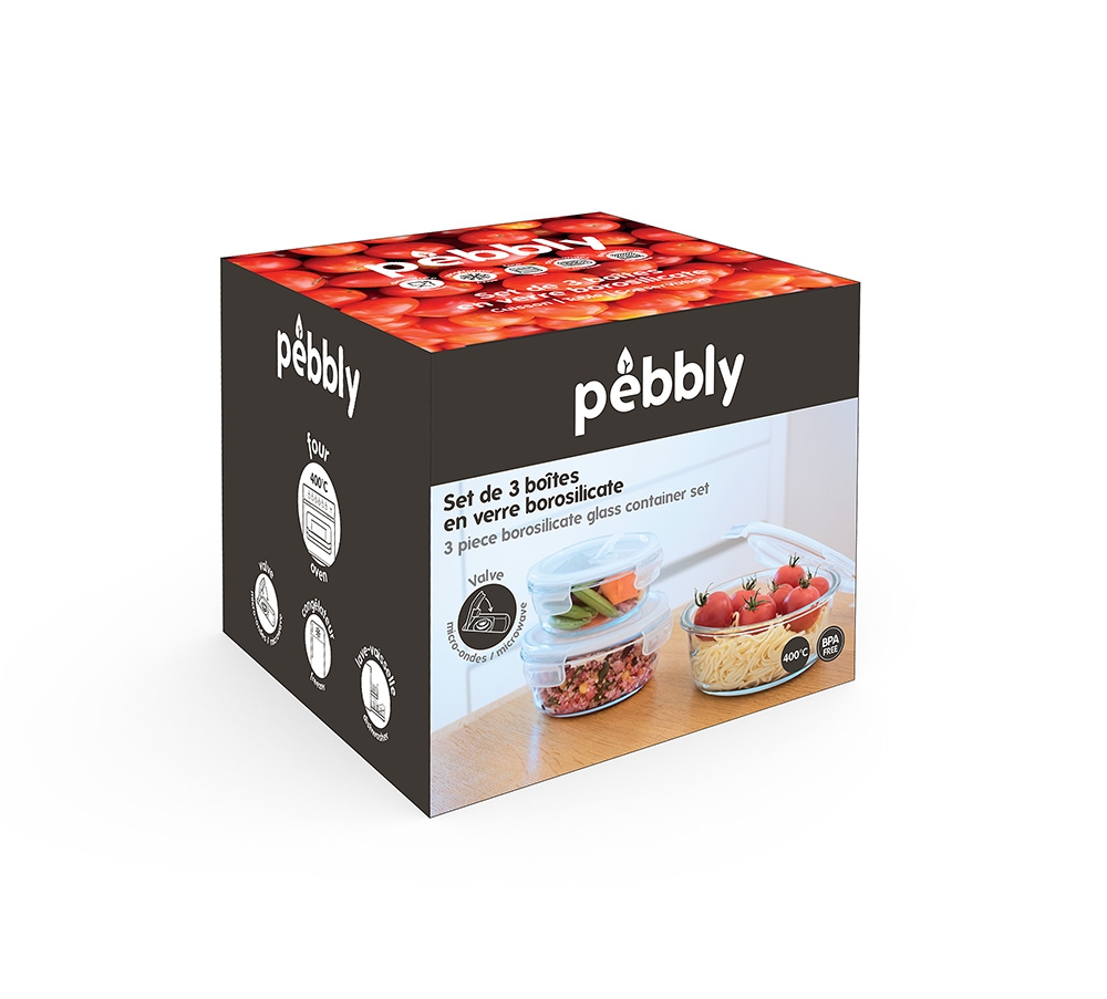 Caractéristiques Set de 3 Boîtes rondes verre borosilicate Pebbly