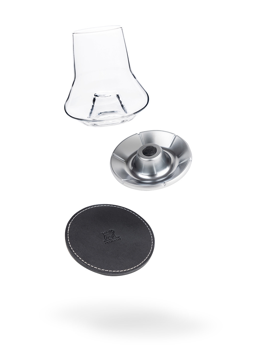 Verre de dégustation. Capacité 30 cl. Hauteur 10 cm. Socle en métal. Sous verre en cuir. Livré dans une boîte coffret. Mode d'emploi. Bouteille non comprise.