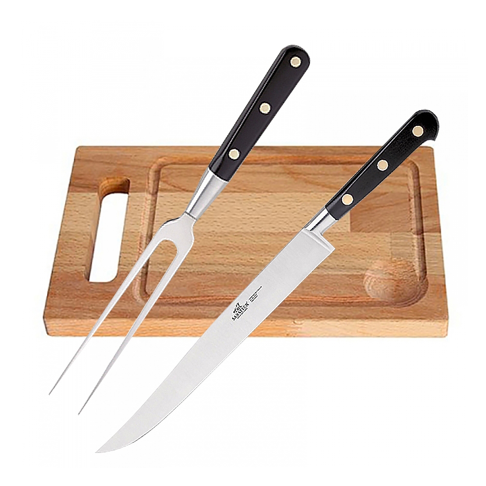 Voilà un bel ensemble qui en plus de sa fabrication française se distingue par son excellent rapport qualité-prix. Il se compose d'abord d'une planche à découper monobloc de marque Roger Orfevre. En hêtre massif, elle vraimentt très résistante. Son format compact est adapté à toutes les découpes courantes, rôtis ou volailles. Rigole et bac récupérateur de jus inclus.