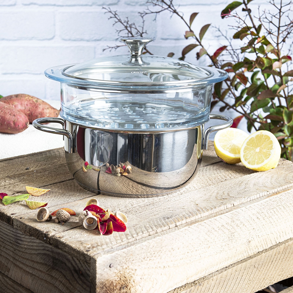 Pour une cuisson saine et respectueuse de vos aliments, optez pour ce set cuit-vapeur en acier inoxydable 18/10 composé d'un faitout Cookway Master, d'un cuit-vapeur en verre et d'un couvercle en verre Master.