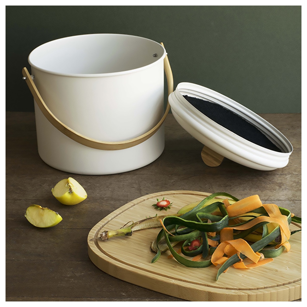 Le Set Seau Compost Pebbly "Zéro déchets" se compose d'un seau à compost d'une contenance de 4,5 litres (avec couvercle), d'un filet à légumes en coton bio, d'un couteau d'office en métal et bambou et d'une planche à découper en bambou.