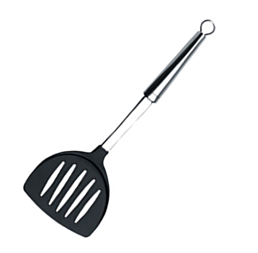 Manche en Inox 18/10 poli. Spatule nylon résistant aux hautes températures. Anneau d'accroche. Va au lave vaisselle.
