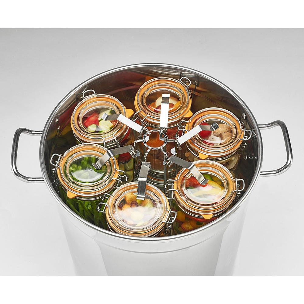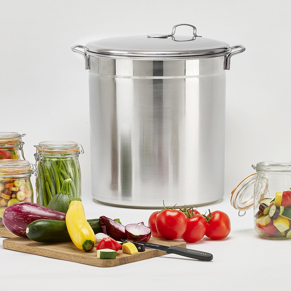 Le Stérilisateur à Bocaux Guillouard est réalisé en acier inoxydable et compatible tous feux sauf induction. Il est livré avec une colonne centrale en acier inoxydable et 6 ou 12 ressorts pour fixer les bocaux afin d'éviter que ces derniers ne bougent durant la stérilisation. Un trou central sur le couvercle permet d'introduire un
